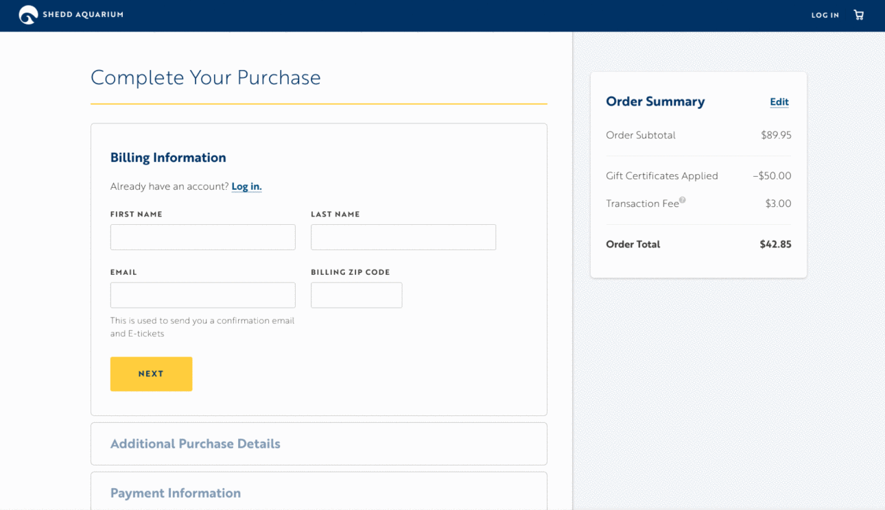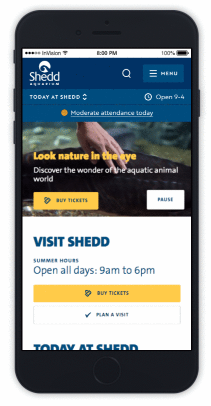 Shedd Aquarium is Chicago’s largest aquarium and one of the city’s premiere attractions. As part of a broad overhaul of Shedd’s digital presence, I led the redesign of its ecommerce experience. This was a multifaceted, months-long process that encompassed integration with the current ecommerce vendor, Tessitura, and the brand new informational website at sheddaquarium.org. For this project, I designed in Figma at high-fidelity and created prototypes with InVision.